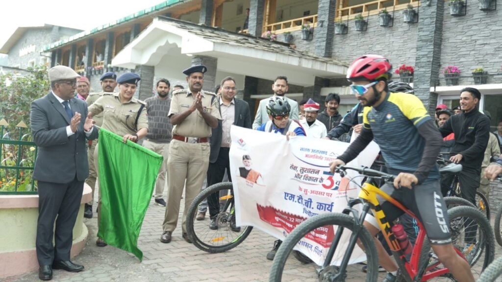 सेवा, सुशासन और विकास के 03 वर्ष पूर्ण होने के सुअवसर पर सप्ताह भर मनाए जाने वाले जन सेवा बहुउद्देशीय शिविर कार्यक्रमों के तहत जिलाधिकारी विनोद गोस्वामी ने एम.टी.बी साईकिल रैली को कलेक्ट्रेट परिसर से शाम 4:30 में हरी झंडी दिखाकर शुभकामनाएं के साथ रवाना किया और कहा कि फिटनेस के लिए साइक्लिंग करना बहुत जरूरी है और पहाड़ों में साइक्लिंग करने के लिए उनके जज्बे को सलाम भी किया।