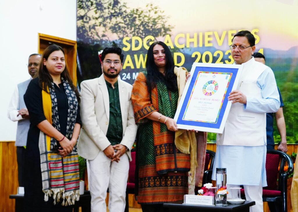 मुख्यमंत्री श्री पुष्कर सिंह धामी ने सोमवार को मुख्यमंत्री आवास स्थित मुख्य सेवक सदन में एस.डी.जी एचीवर अवार्ड समारोह में 3 व्यक्तियों, 09 संस्थानों और 04 औद्योगिक प्रतिष्ठानों को एसडीजी अचीवर अवार्ड से सम्मानित किया। पिछले वर्ष के एसडीजी अवॉर्ड से पुरस्कृत व्यक्तियों और संस्थानों द्वारा की जा रही अभिनव पहलों की पुस्तक ‘अग्रगामी 2.0’ और एसडीजी इंडेक्स उत्तराखण्ड 2023-2024 का लोकार्पण भी इस अवसर पर मुख्यमंत्री ने किया। सी०पी०पी०जी०जी० द्वारा वर्ष 2023-24 के लिए जारी जनपदवार एस०डी०जी० रैंकिंग में नैनीताल जनपद ने प्रथम स्थान, देहरादून दूसरे और उत्तरकाशी तीसरे स्थान पर रहे, तीनों जनपदों के मुख्य विकास अधिकारी को मुख्यमंत्री