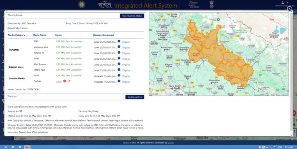 IMD देहरादून के द्वारा सतही हवा के साथ मध्यम गरज के साथ तूफान 03 घंटे का ऑरेंज अलर्ट जारी किया गया जिसकी समय अवधि 25-05-2025, 5:00 am से 25-05-2025, 8:00 am तक है, अलर्ट में अल्मोड़ा, चंपावत, देहरादून, हरिद्वार, नैनीताल, पौड़ी गढ़वाल, टिहरी गढ़वाल, उधम सिंह नगर में कुछ स्थानों पर सतही हवा (40-50 किमी प्रति घंटे) के साथ मध्यम गरज के साथ बौछारें पड़ने/ ओलावृष्टि/ तीव्र वर्षा होने की संभावना है।