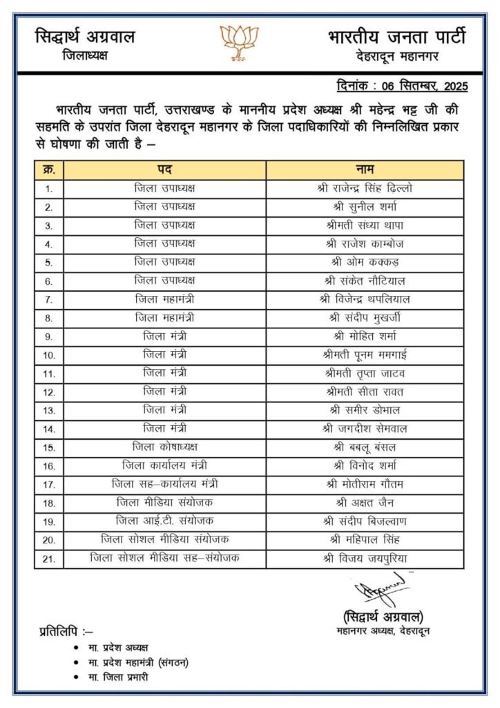 भारतीय जनता पार्टी जिला देहरादून महानगर के जिला पदाधिकारीयो की घोषणा September 7, 2025 admin देहरादून। भारतीय जनता पार्टी जिला देहरादून महानगर के जिला पदाधिकारीयो की घोषणा कर दी गई है। Facebook Twitter LinkedIn WhatsApp