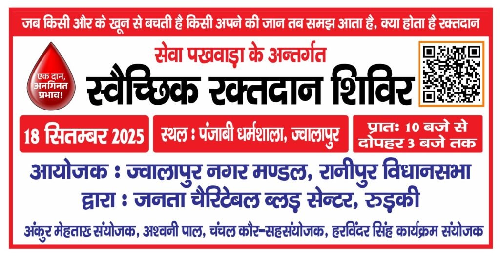 भारतीय जनता पार्टी सेवा पखवाड़ा के अन्तर्गत ज्वालापुर नगर मण्डल भाजपा ने किया रक्त दान शिविर का आयोजन