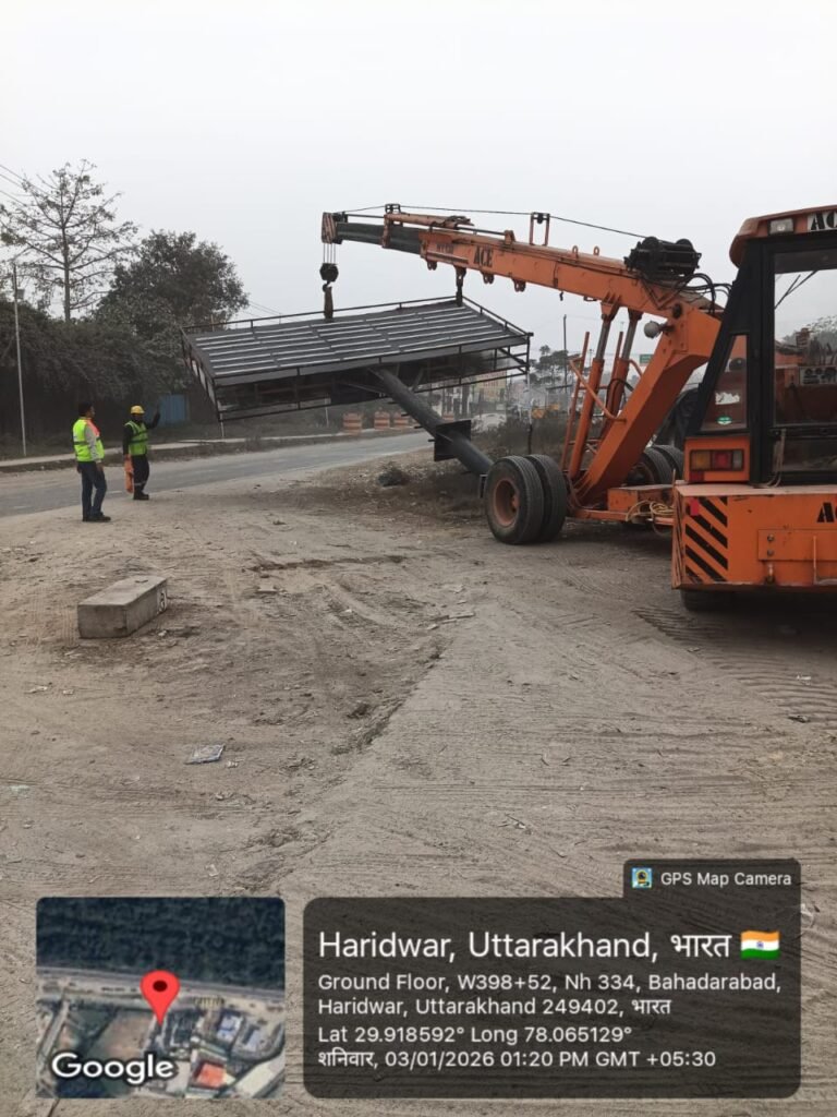 अधिशासी अभियंता एनएचएआई अतुल शर्मा ने अवगत कराया है कि जिलाधिकारी के निर्देशों के अनुपालन में राष्ट्रीय राजमार्ग संख्या 334 के किनारों से एवं रानीपुर झाल से बहादराबाद बाईपास क्षेत्रांतर्गत अवैध रूप एवं बिना अनुमति के लगाए गए बड़े बड़े यूनीपोल एवं होर्डिंग को राष्ट्रीय राजमार्ग प्राधिकरण द्वारा अधिकृत एजेंसी की टीम द्वारा हटाया जा रहा है। उन्होंने यह भी अवगत कराया है कि राष्ट्रीय राजमार्ग के किनारे बनाए गए खोखे, झुगी झोपड़ी को भी हटाया जा रहा है।