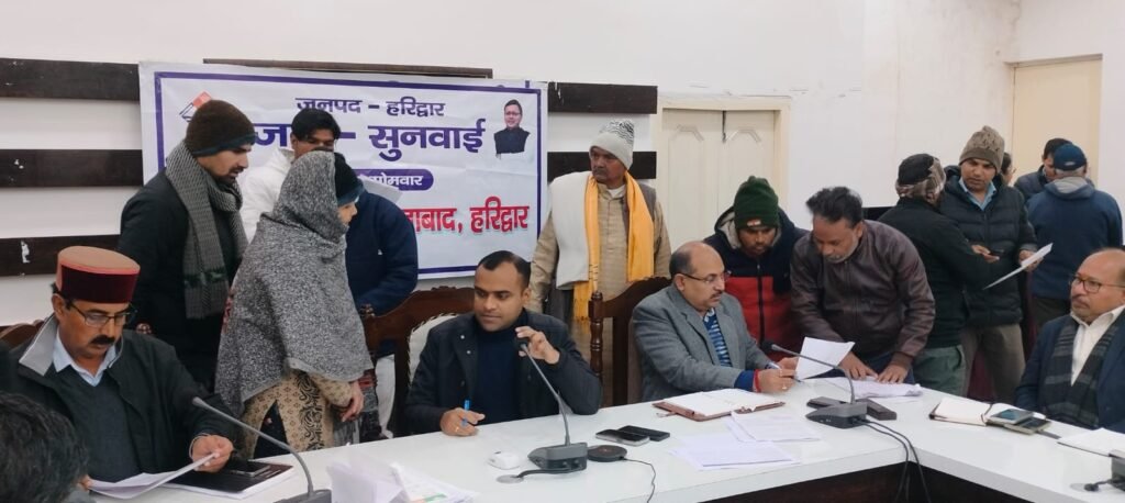 *हरिद्वार। जनपदवासियों की समस्याओं का त्वरित निराकरण करने के उद्देश्य से जिलाधिकारी मयूर दीक्षित की अध्यक्षता में जिला कार्यालय सभागार में जन सुनवाई कार्यक्रम आयोजित किया गया, जिसमें विभिन्न विभागों से संबंधित 87 शिकायते/ समस्याएं दर्ज कराई गई जिसमें से 42 समस्याओं का मौके पर निराकरण किया गया शेष समस्याओं को निस्तारण हेतु संबंधित विभागों को प्रेषित किया गया।