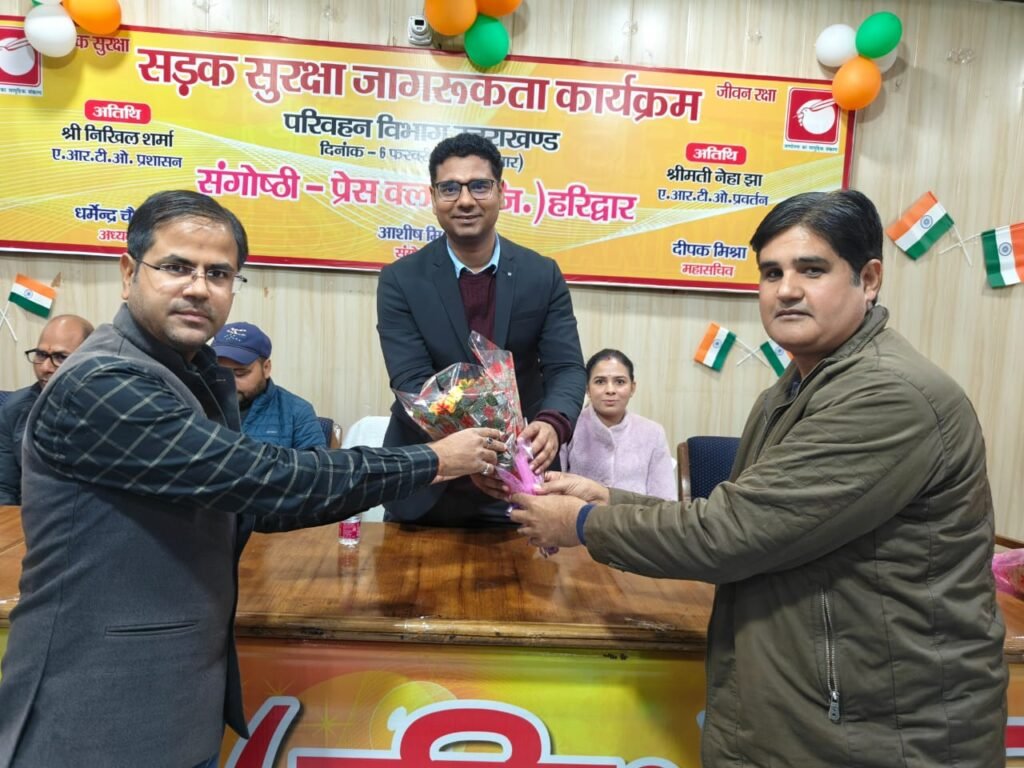 हरिद्वार। सड़क दुर्घटनाओं पर प्रभावी अंकुश लगाने और आमजन को यातायात नियमों के प्रति जागरूक करने के उद्देश्य से सड़क सुरक्षा जागरूकता कार्यक्रम के तहत परिवहन विभाग हरिद्वार द्वारा प्रेस क्लब में संगोष्ठी का आयोजन किया गया। कार्यक्रम में परिवहन विभाग के अधिकारी, प्रेस क्लब पदाधिकारी एवं पत्रकार मौजूद रहे। मुख्य अतिथि एआरटीओ प्रशासन निखिल शर्मा तथा विशिष्ट अतिथि एआरटीओ प्रवर्तन नेहा झा ने यातायात नियमों की जानकारी देते हुए दुघर्टनाओं से बचाव के लिए वाहन चलाते समय नियमों का पालन करने, सीट बेल्ट लगाने और दोपहिया वाहन चलाने के दौरान हेलमेट अवश्य लगाने की अपील की और सभागार में मौजूद सभी पत्रकारों को यातायात नियमों का पालन करने की शपथ भी दिलायी। इस दौरान परिवहन विभाग की और से सभी पत्रकारों को हेलमेट भी वितरित किए गए। प्रेस क्लब अध्यक्ष धर्मेंद्र चौधरी, महामंत्री दीपक मिश्रा एवं कार्यक्रम संयोजक आशीष मिश्रा ने सभी अतिथियों का पुष्पगुच्छ भेंट कर स्वागत किया। गोष्ठी का संचालन प्रेस क्लब महामंत्री दीपक मिश्रा ने किया।