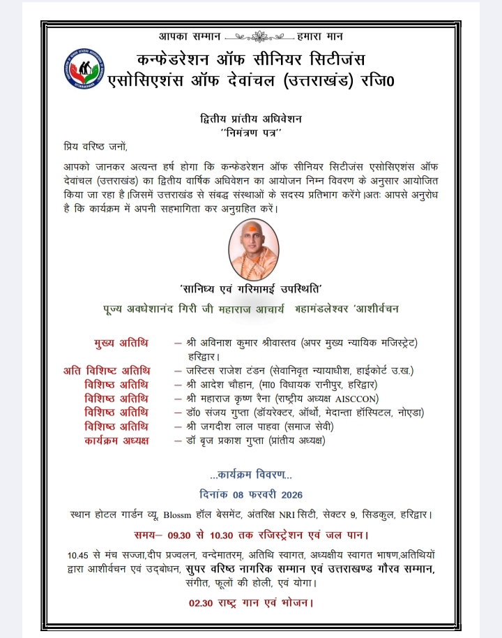 हरिद्वार। कन्फेडरेशन ऑफ सीनियर सिटीजंस एसोसिएशंस आफ देवांचल उत्तराखंड का द्वितीय प्रांतीय अधिवेशन का आयोजन 8 फरवरी को सिडकुल स्थित एक होटल में स्वामी अवधेशानंद गिरी जी महाराज की उपस्थिति में किया जाएगा।