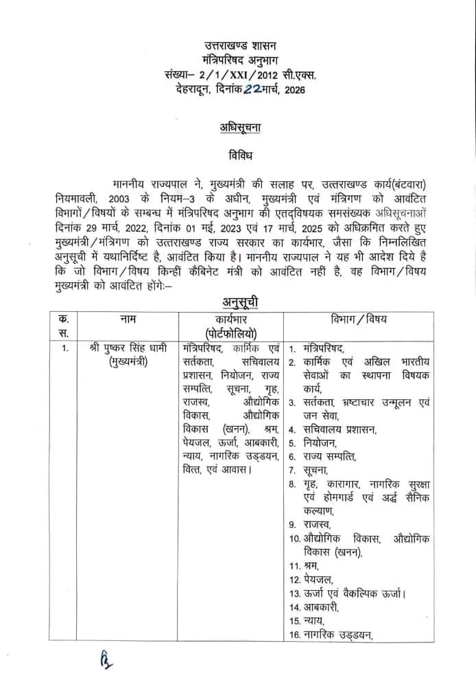 मुख्यमंत्री श्री पुष्कर सिंह धामी ने मंत्रिमंडल के सदस्यों को विभागों का दायित्व सौंपा।