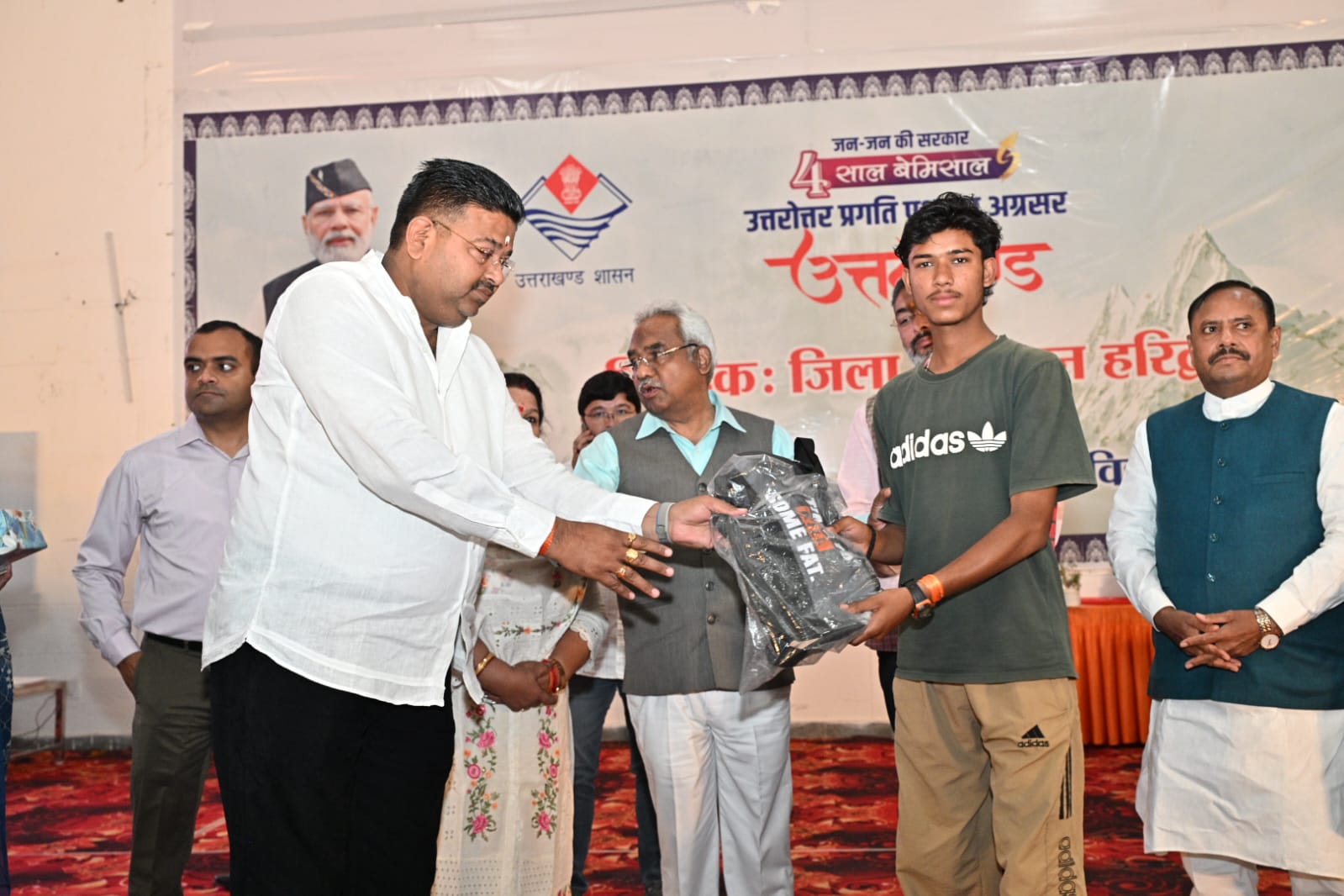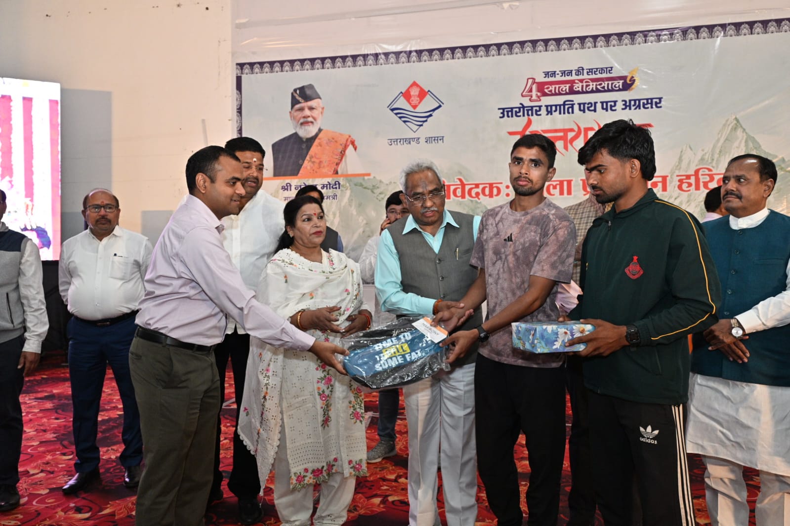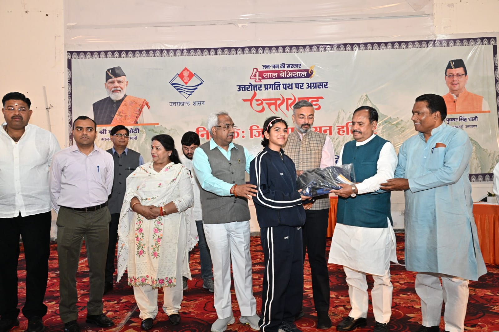 इस अवसर पर मुख्य अतिथियों द्वारा सूचना एवं लोकसंपर्क विभाग द्वारा प्रकाशित विकास पुस्तिका संकल्प से सिद्धि: विकसित उत्तराखंड बेमिसाल विकास और नई पहल के चार वर्ष का विमोचन किया तथा विभिन्न विभागों की योजनाओं के पात्र लाभार्थियों को योजना से लाभान्वित किया गया,जिसमें सहकारिता विभाग द्वारा पंडित दीनदयाल उपाध्याय सहकारी किसान योजना के अन्तर्गत 50 लाभार्थियों को 5613000 धनराशि के चेक वितरित किए गए।लघु उद्योग में हथकरघा एवं हस्तशिल्प में जिला स्तर पर पुरस्कार प्राप्त करने वाले प्रथम एवं द्वितीय स्थान प्राप्त करने वाले 14 लोगो को प्रशस्ति पत्र देकर सम्मानित किया गया तथा  बाल विकास विभाग द्वारा 40 महिलाओं को महालक्ष्मी किट वितरित किए गए तथा समाज कल्याण विभाग द्वारा 09 दिव्यांगजनो को बैसाखी, झड़ी और व्हील चेयर वितरित किए गए। एनआरएलएम 6एवं रिप द्वारा 25 एसएचजी की महिलाओं को क्लाउड किचन का प्रशिक्षण दिया गया था तथा उनके व्यवसाय को शुरू करने के लिए चार महिलाओ को 02 -02 लाख का मुद्रा लोन के चेक वितरित किए गए।इस अवसर पर खेल विभाग द्वारा आयोजित मैराथन दौड़ में उत्कृष्ट प्रदर्शन करने वाले अंडर 16 में 05 बालक एवं 05 बालिकाओं तथा ओपन वर्ग में 05 बालक एवं 05 बालिकाओं को पुरस्कृत किया गया।