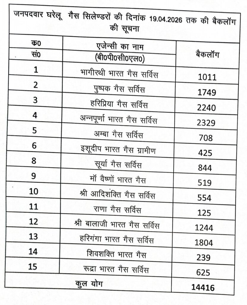 जिला पूर्ति अधिकारी ने पत्र प्रेषित करते हुए अवगत कराया है कि दिनांक 19 अप्रैल 2026 तक जनपद में संचालित गैस एजेंसियों में आईओसीएल गैस एजेंसियों के बैकलॉग की संख्या 44245 एवं बीपीसीएल गैस एजेंसियों के बैकलॉग की संख्या 14416 है,जो कि दैनिक आपूर्ति की जा रही एलपीजी गैस सिलेंडरों की संख्या से बहुत अधिक है एवं निरंतर रूप से उपभोक्ताओं द्वारा गैस बुकिंग किए जाने के फलस्वरूप बैकलॉग लगातार बढ़ता ही जा रहा है,जबकि मांग अनुसार घरेलू एलपीजी गैस की आपूर्ति नहीं हो पा रही है,जिससे जन आक्रोश बढ़ता ही जा रहा है एवं अव्यवस्था उत्पन्न हो रही है।
