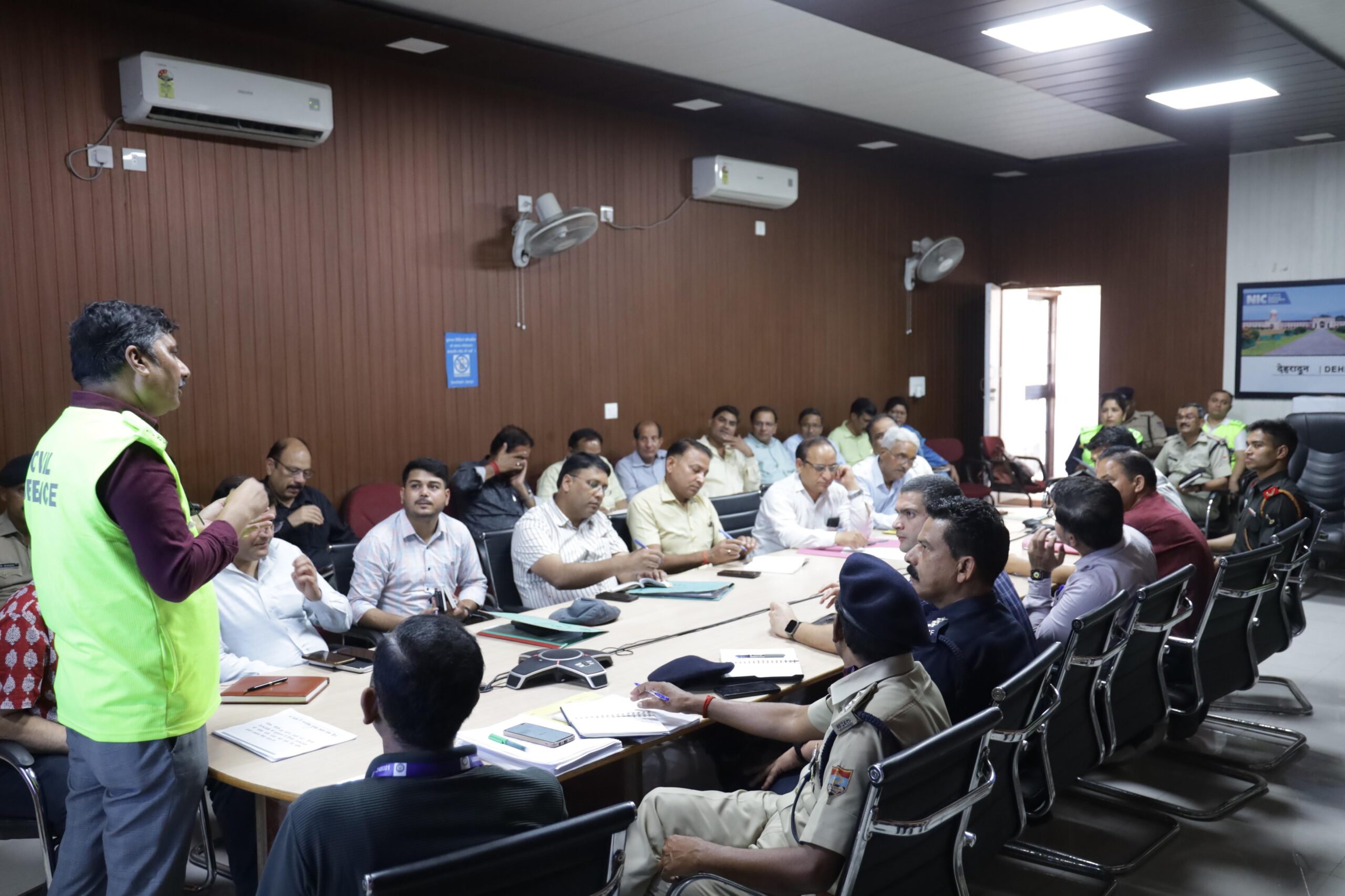देहरादून  नागरिक नागरिक सुरक्षा एयर रेड/ब्लैक आउट के सम्बन्ध में महानिदेशालय अग्निशमन सेवा, नागरिक सुरक्षा एवं गृहरक्षक,  गृह मंत्रालय भारत सरकार द्वारा निर्धारित एसओपी के अनुसार 24 अपै्रल 2026 को रात्रि में 10 बजे आयोजित की जाने वाले मॉक अभ्यास के सम्बन्ध में जिलाधिकारी/ अध्यक्ष जनपद आपदा प्रबन्धन प्राधिकरण सविन बसंल के निर्देशोंके अनुपालन में सम्बन्धित रेखीय विभागों के अधिकारियों के साथ एनआईसी सभागार में टेबल टॉप बैठक आयोजित की गई। बैठक में रेखीय विभाग एवं तहसील स्तर पर (तहसील सदर)  गठित आईआरएस नामित अधिकारी उपस्थित रहे।