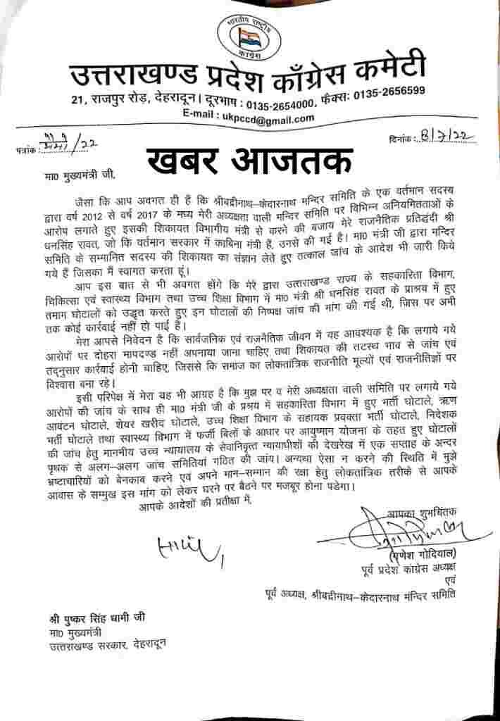 आप इस बात से भी अवगत होंगे कि मेरे द्वारा उत्तराखण्ड राज्य के सहकारिता विभाग, चिकित्सा एवं स्वास्थ्य विभाग तथा उच्च शिक्षा विभाग में मा0 मंत्री श्री धनसिंह रावत के प्राश्रय में हुए तमाम घोटालों को उद्धृत करते हुए इन घोटालों की निष्पक्ष जांच की मांग की गई थी, जिस पर अभी तक कोई कार्रवाई नहीं हो पाई है। मेरा आपसे निवेदन है कि सार्वजनिक एवं राजनैतिक जीवन में यह आवश्यक है कि लगाये गए आरोपों पर दोहरा मापदण्ड नहीं अपनाया जाना चाहिए तथा शिकायत की तटस्थ भाव से जांच एवं तद्नुसार कार्रवाई होनी चाहिए। जिससे कि समाज का लोकतांत्रिक राजनीति मूल्यों एवं राजनीतिज्ञों पर विश्वास बना रहे।