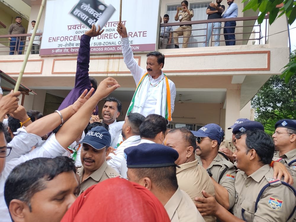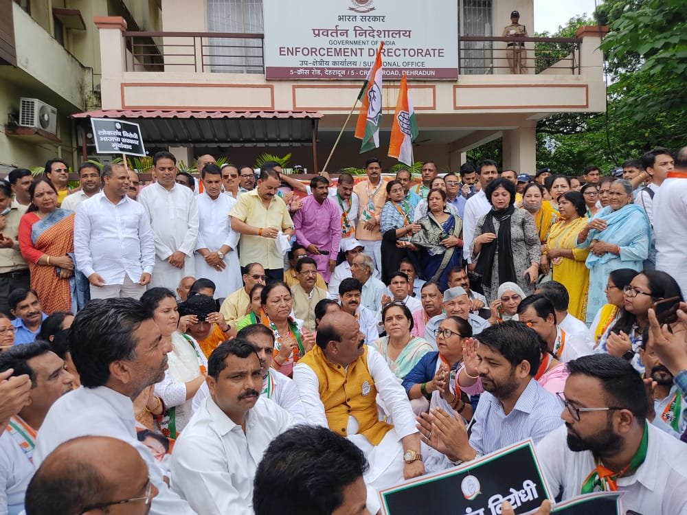 कांग्रेस पार्टी ने केन्द्र की मोदी सरकार पर केन्द्रीय ऐजेंसियों का इस्तेमाल कांग्रेस के शीर्ष नेतृत्व के उत्पीडन के लिए करने का आरोप लगाते हुए इसकी कडे शब्दों में निन्दा की है। कांग्रेस पार्टी के शीर्ष नेताओं के खिलाफ की जा रही उत्पीडनात्मक कार्रवाई तथा पार्टी की शीर्ष नेता एवं राष्ट्रीय अध्यक्ष मा0 श्रीमती सोनिया गांधी जी को ईडी द्वारा समन किये जाने के विरोध में आज कांग्रेस कार्यकर्ताओं ने प्रदेश अध्यक्ष श्री करन माहरा के नेतृत्व में राजधानी देहरादून में प्रदेश कांग्रेस कार्यालय से क्रास रोड स्थित ईडी कार्यालय तक विशाल रैली निकालते हुए ईडी कार्यालय के सामने विरोध-प्रदर्शन किया। कार्यक्रम में पार्टी के विधायक, पूर्व विधायक, वरिष्ठ नेतागण तथा सैकडों की संख्या में कार्यकर्ता उपस्थित थे। कार्यक्रम का संचालन प्रदेश महामंत्री संगठन विजय सारस्वत ने किया।